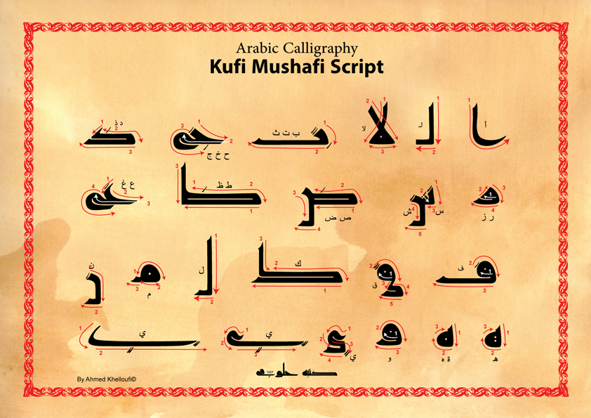 Poster for the Kufic Mushafi Script letters with dots (Nuqta) measurement units and stroke directions.